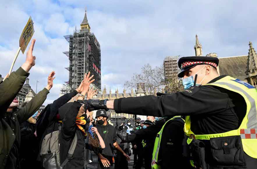 متظاهرون يرفعون أيديهم في وجوه ضباط الشرطة البريطانية خلال مظاهرة في لندن، بريطانيا، 3 أبريل / نيسان 2021