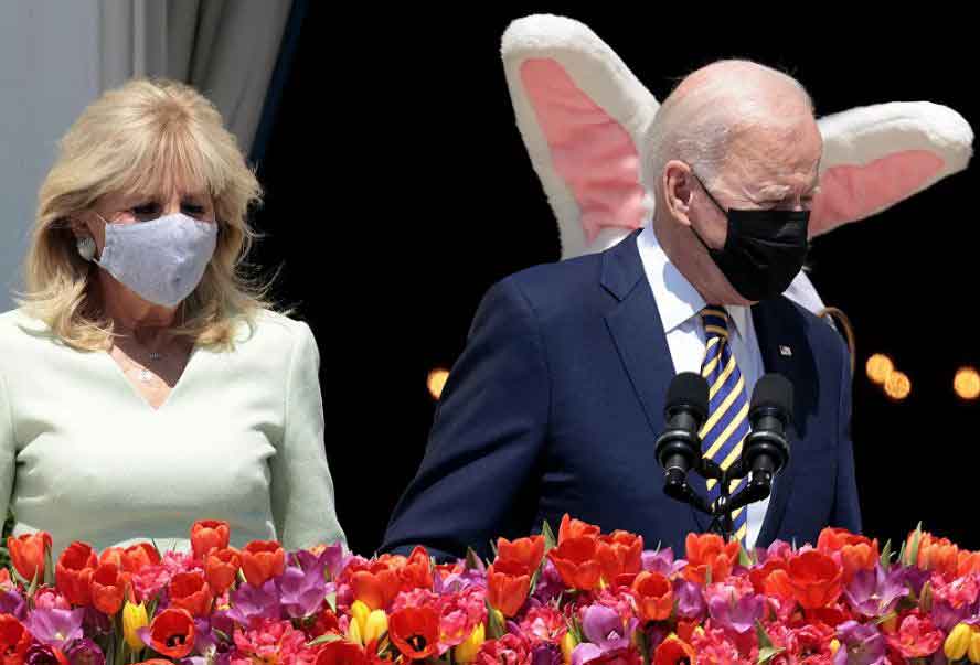 الرئيس الأمريكي جو بايدن والسيدة الأولى جيل بايدن يظهران مع أرنب عيد الفصح في البيت الأبيض، في واشنطن العاصمة 5 أبريل 2021 . تم إلغاء لفة بيض عيد الفصح التقليدية هذا العام بسبب جائحة كورونا.