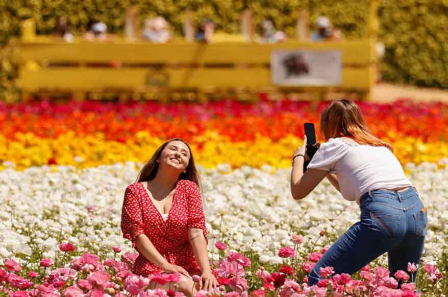الزوار بين أزهار حوذان (Ranunculus) في حديقة “ذا فلاور فيلدز” في كارلسباد، ولاية كاليفورنيا، الولايات المتحدة 31 مارس 2021