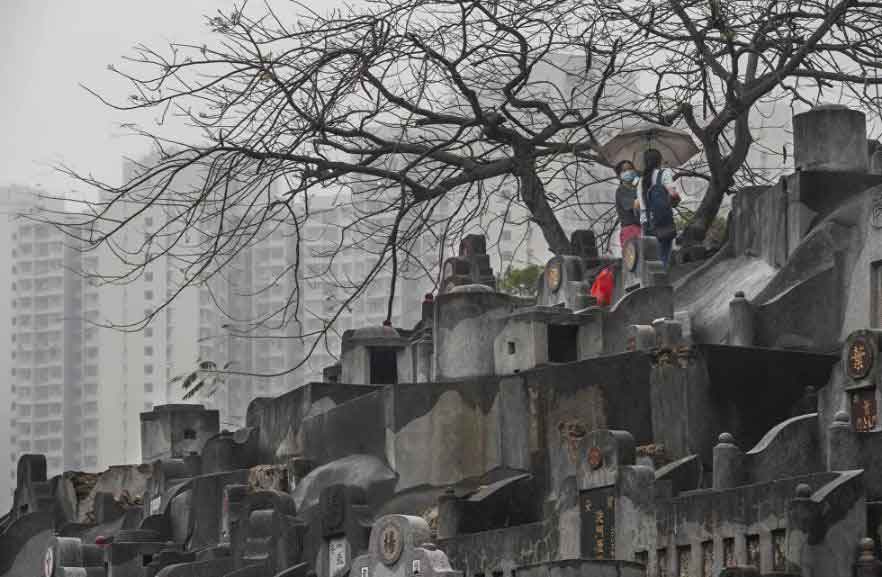 نساء يصلين في مقبرة خلال مهرجان “تشينغ مينغ”، حيث تظهر المباني السكنية العامة في الخلفية في هونغ كونغ، الصين.مهرجان تشينغ مينغ السنوي، عندما يزور الناس قبور أقاربهم المتوفين ويتركون القرابين احتراما لهم ولإحياء ذكراهم، حيث تحاول حكومة هونغ كونغ إبقاء عدد حالات الإصابة بفيروس كورونا (كوفيد-19) تحت السيطرة بينما يتم تطعيم المزيد من الناس بلقاح ضد الفيروس.
