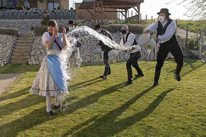 حبس التقليد المجري القديم، في يوم الاثنين بعد عيد الفصح يرتدي الأهالي الأزياء الشعبية، ويقوم الشباب، أعضاء جمعية ماركال للرقص والفنون الشعبية، بصب الماء على الفتيات الشابات، في مينفوكساناك، المجر، 5 أبريل 2021.