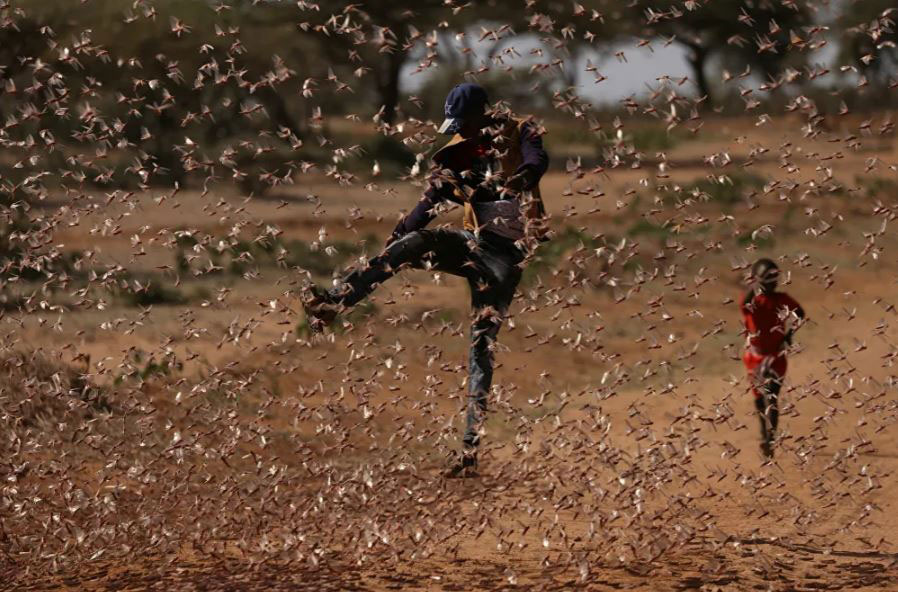 رجل يحاول مطاردة سرب من الجراد الصحراوي في نايبيريري، بالقرب من بلدة روموروتو، كينيا،22 فبراير2021
