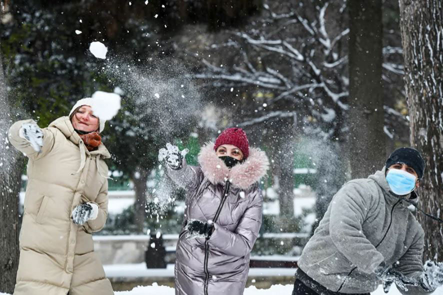 مارة يلعبون بكرات الثلج في أحد شوارع مدينة باكو أثناء تساقط الثلوج الكثيفة في أذربيجان، 24 فبراير 2021