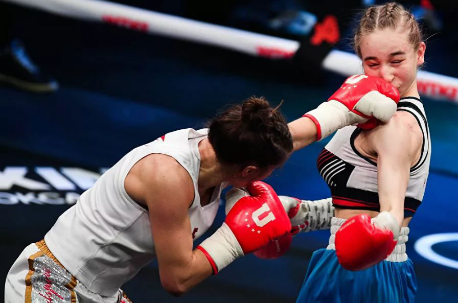 فاطمة دودييفا (روسيا) أثناء معركة ملاكمة مع تاتيانا أليكسييفا (روسيا) (يمين) في إطار عرض “أمسية الملاكمة” في فيغاس سيتي هول، موسكو، روسيا 20 فبراير 2021