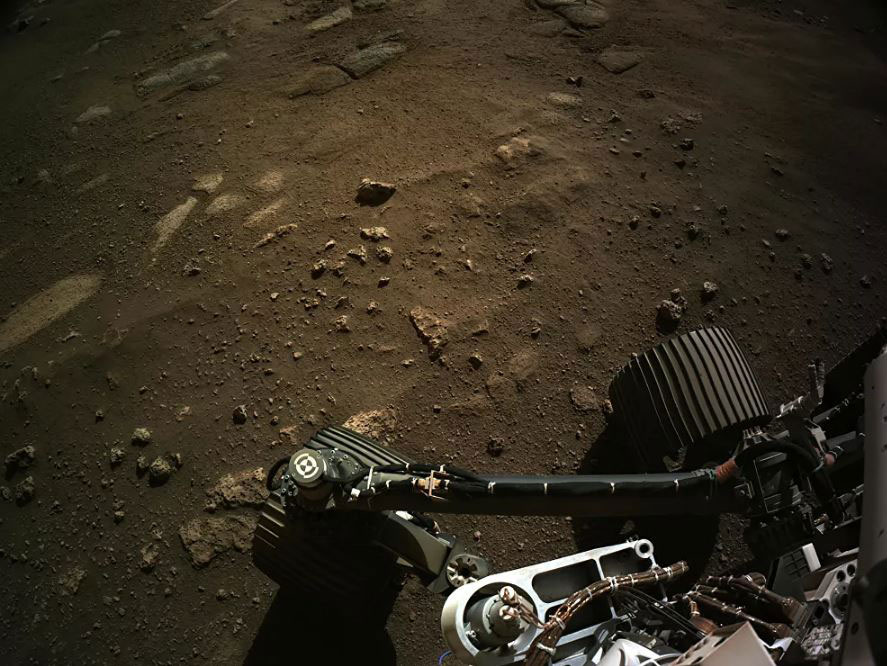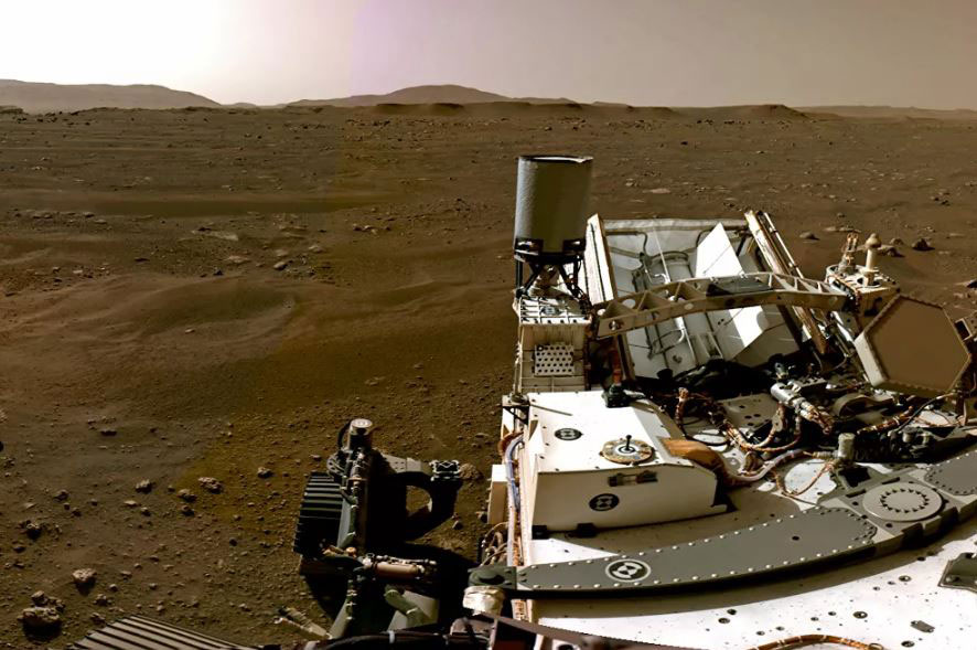 صورة بانوراما مكونة من عدة صور فردية التقطتها كاميرات الملاحة، أو “نافكامس”، على متن المركبة المتجولة “بيرسيفرانس مارس” التابعة لوكالة الفضاء الدولية “ناسا”، منظر كوكب المريخ في 20 فبراير 2021. صور المركبة “بيرسيفرانس مارس” تشبه بصور سيلفي لها على المريخ.