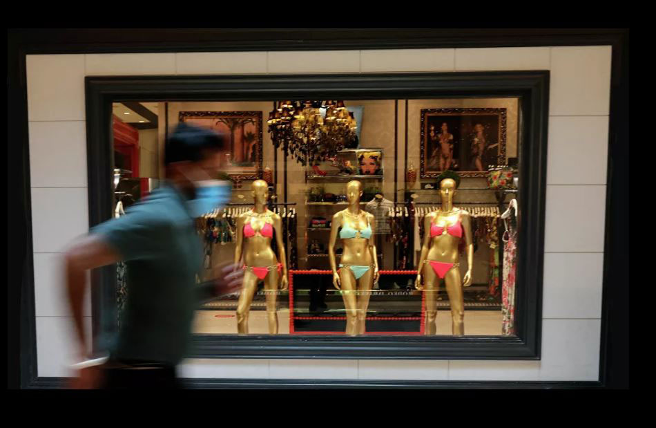 رجل يرتدي كمامة يركض أمام متجر فاخر يعرض زي السباحة “بيكيني”، في نخلة الجميرة في دبي، الإمارات 24 فبراير 2021