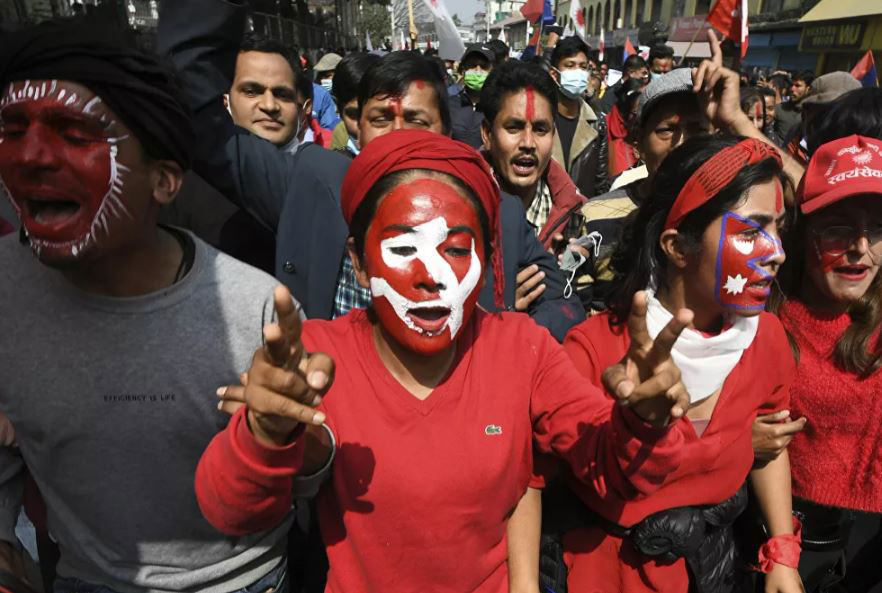 أنصار فصيل من الحزب الشيوعي النيبالي الحاكم يشاركون في مسيرة “الانتصار” بعد قرار المحكمة العليا أمس بإلغاء قرار رئيس الوزراء بحل البرلمان، 24 فبراير 2021