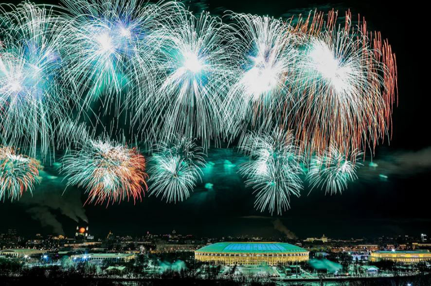 ألعاب نارية فوق ملعب “لوجنيكي” في موسكو، بمناسبة عيد حماة الوطن في روسيا، 23 فبراير 2021