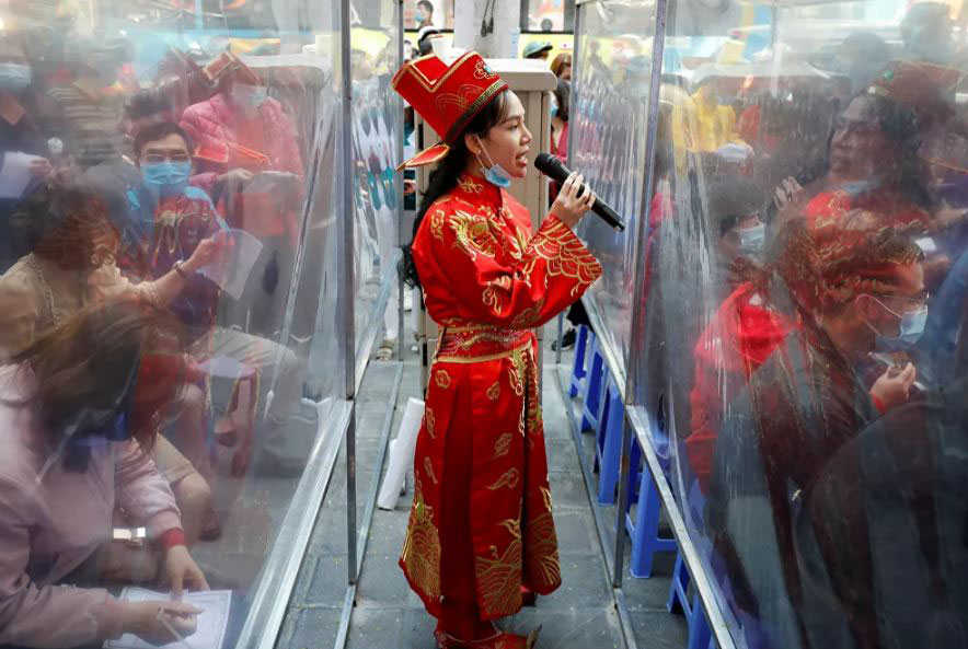 موظفة متجر للذهب ترتدي زي “إله الثروة” في متجر للمجوهرات في “يوم إله الثروة” ، الذي يصادف اليوم العاشر من السنة القمرية الجديدة، حيث يأمل الفيتناميون في أن يجلب شراء الذهب الحظ السعيد، هانوي، فيتنام، 21 فبراير 2021