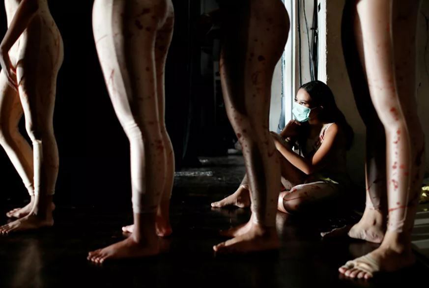 راقصة ترتدي قناعًا واقيًا للحد من انتشار مرض فيروس كورونا (كوفيد-19)، تجلس خلال عرض للرقص الافتراضي بعنوان “قصة رجل: بحثًا عن مثال جديد” لفرقة “نامارينا يوث دانس”، في مبنى جاكرتا للفنون، إندونيسيا، 21 فبراير 2021