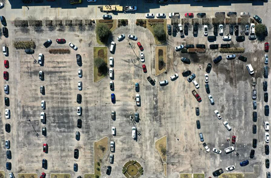هيوستن، تكساس – 20 فبراير: صورة جوية بطائرة بدون طيار للسيارات تقف في طابور خلال توزيع المياه في مركز فاونتن لايف في 20 فبراير 2021 في هيوستن، تكساس