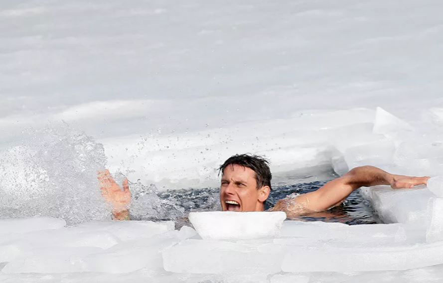 رد فعل الغواص التشيكي ديفيد فينسل، بعد كسر الرقم القياسي العالمي الجديد في السباحة تحت الجليد، في بحيرة في مقلع سابق في قرية لاهوست بالقرب من مدينة تبليتسه، جمهورية التشيك، 23 فبراير 2021