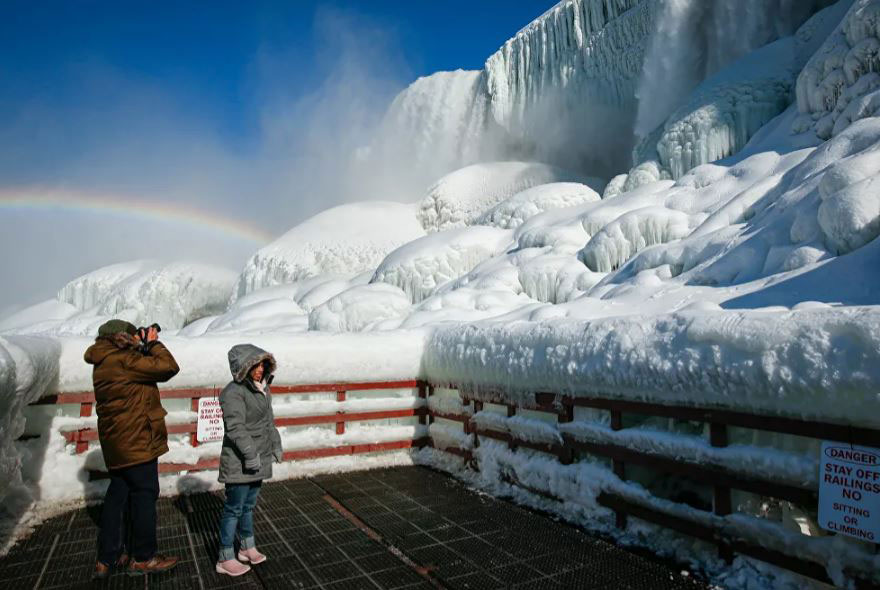 الزوار يلتقطون صوراً لقوس قزح تكون فوق شلالات نياجرا، ولاية نيويورك، الولايات المتحدة، 21 فبراير 2021
