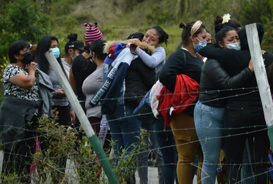 يتجمع أقارب السجناء خارج سجن “توري”، حيث اندلعت أعمال شغب في كوينكا، الإكوادور، 23 فبراير 2021. اندلعت أعمال شغب مميتة في سجون في ثلاث مدن في جميع أنحاء البلاد بسبب المعارك بين العصابات المتناحرة، وفقًا للشرطة.