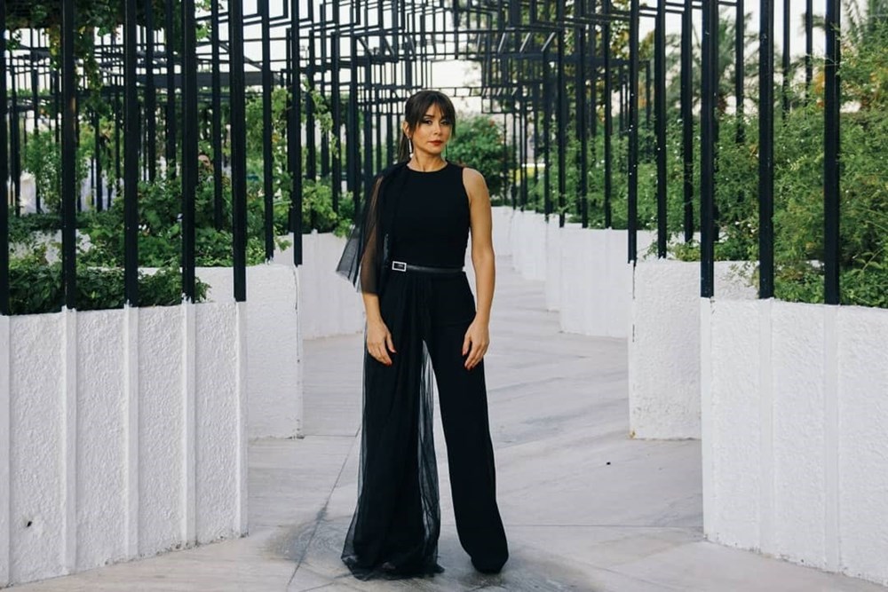 إذا كنتِ تحبين الجمبسوت، فيمكنكِ اقتباس هذه الإطلالة من الفنانة السورية الأنيقة، حيث تألقت بجمبسوت أسود، يتميز بحزام على منطقة الخصر لتحديد قوامها، ومزود بذيل طويل من التول، لإضافة لمسة جمالية أنيقة، واعتمدت مكياجاً دراماتيكياً قوياً، فقد لجأت إلى الآيلاينر الأسود، وأحمر الشفاه أحمر اللون القوي، ليتناسب مع إطلالتها السوداء الراقية.