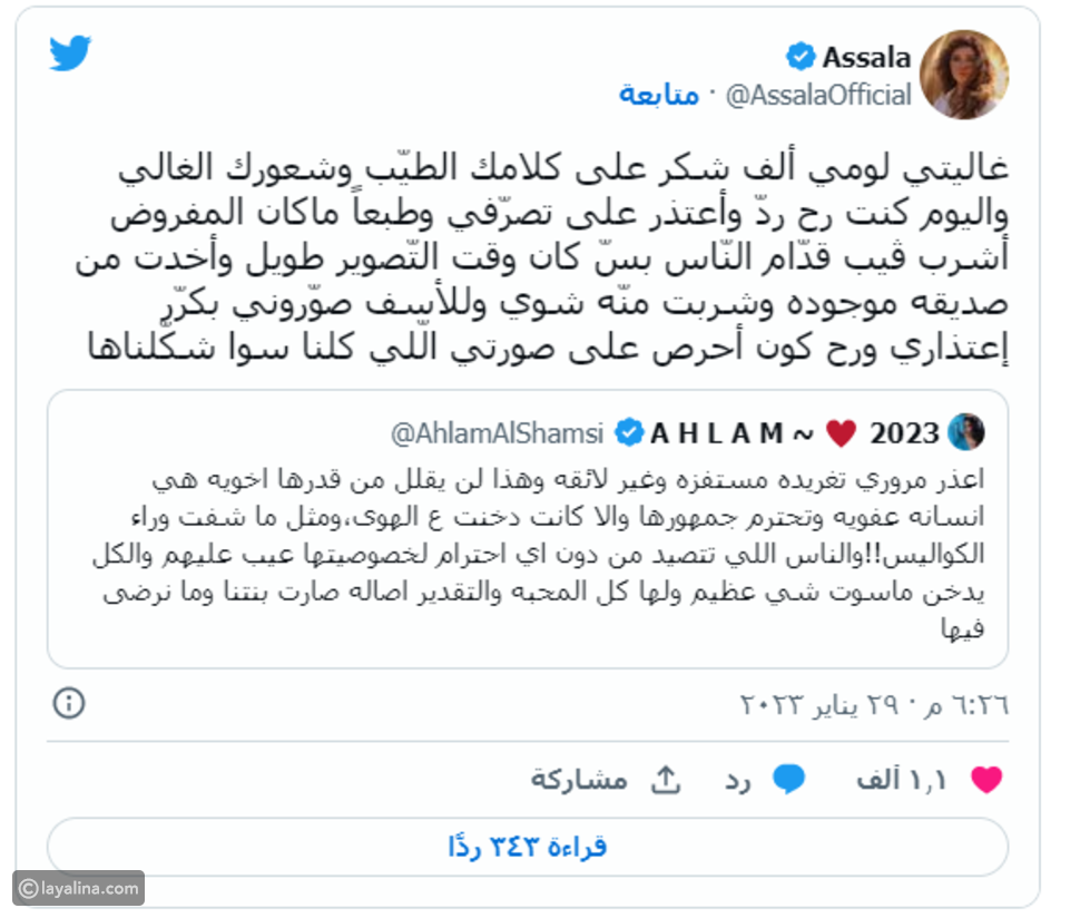 وأعادت أصالة نصري نشر تدوينة دافعت فيها الفنانة أحلام الشامسي عنها عبر حسابها الشخصي على موقع التواصل الاجتماعي تويتر، مشيرة إلى أنها قررت الرد والاعتذار.