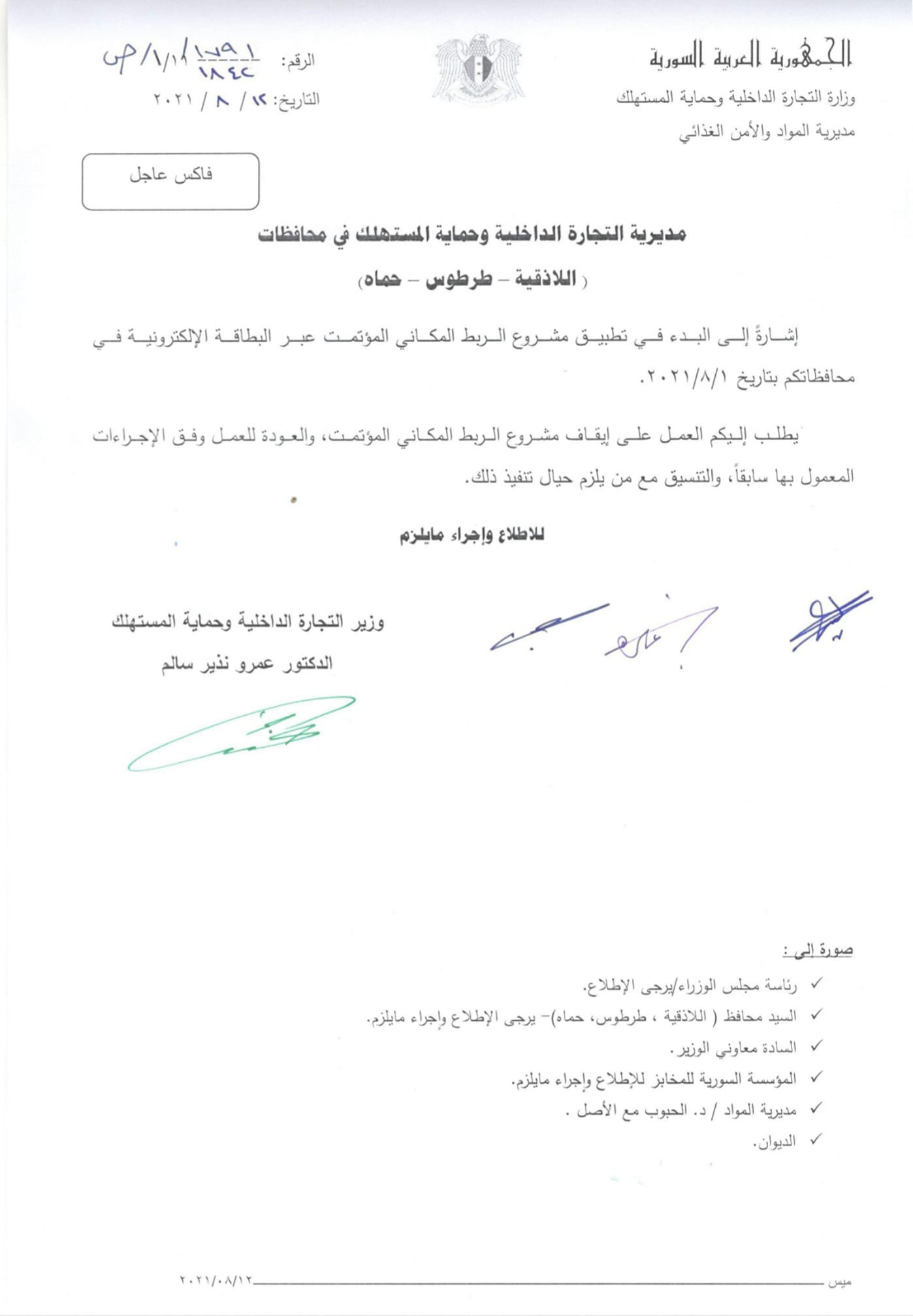 هوى الشام| أصدر وزير التجارة الداخلية وحماية المستهلك الدكتور عمرو سالم قراراً بإيقاف الربط المكاني المؤتمت الخاص بتوطين بيع الخبز عبر البطاقة الالكترونية في محافظات اللاذقية وطرطوس وحماة.