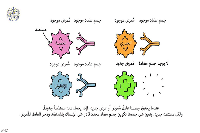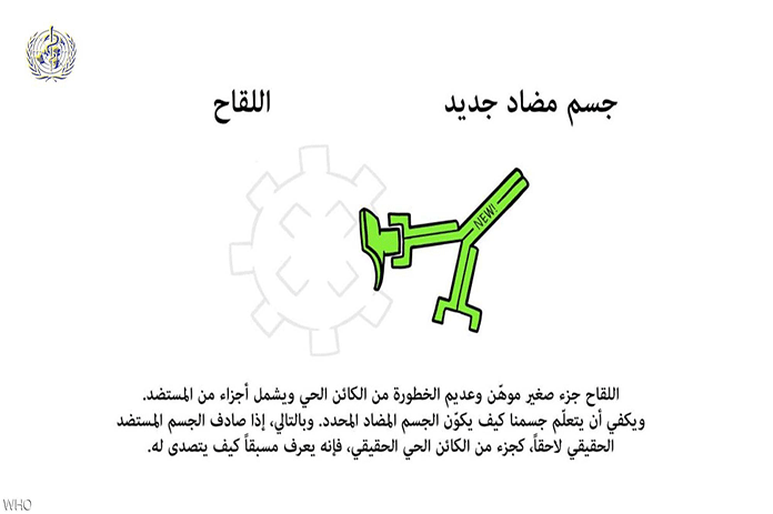 وأضاف تقرير المنظمة أن العامل الممرض هو جرثومة أو فيروس أو طُفيلي أو فُطر يمكن أن يسبب المرض داخل الجسم. ويتكون كل عامل ممرض من عدة أجزاء فرعية، عادة ما تكون مرتبطة تحديداً بذلك العامل الممرض وبالمرض الذي يسببه. ويسمى الجزء الفرعي من العامل الممرض الذي يتسبّب في تكوين الأجسام المضادة بالمستضد.