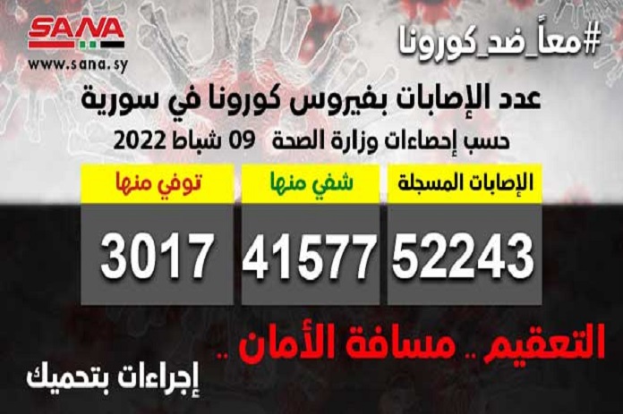 وأوضحت الوزارة في بيان تلقت سانا نسخة منه أن عدد الإصابات المسجلة في سورية بلغ حتى الآن 52243 شفي منها 41577 حالة وتوفي 3017 حالة.