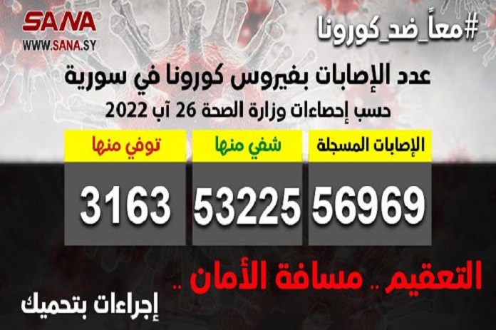وأوضحت الوزارة في بيان تلقت سانا نسخة منه أن عدد الإصابات المسجلة في سورية بلغ حتى الآن 56969 شفيت منها 53225 حالة وتوفيت 3163 حالة.