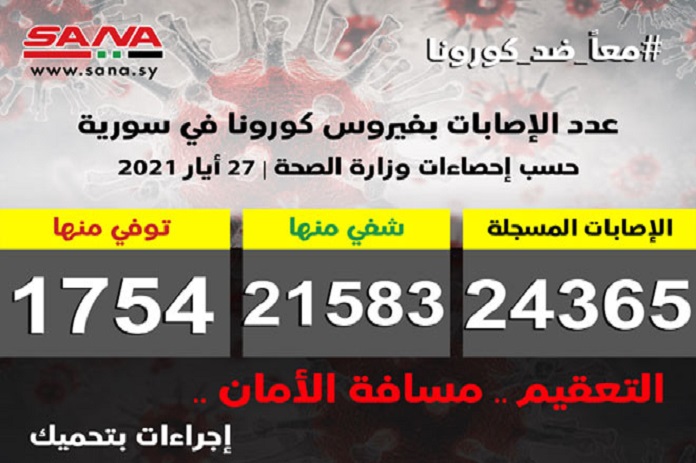 وأوضحت الوزارة في بيان تلقت سانا نسخة منه أن عدد الإصابات المسجلة في سورية بلغ حتى الآن 24365 شفيت منها 21583 وتوفيت 1754 حالة.