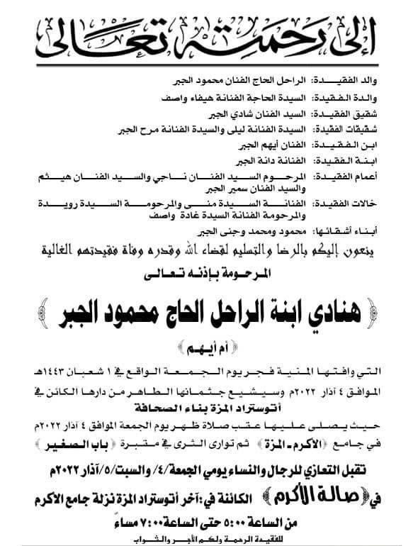 هوى الشام| نعت الفنانة السورية دانا جبر عبر حساباتها في شبكات التواصل الاجتماعي، والدتها هنادي ابنة الفنان الراحل محمود جبر، معلنةً مواراة جثمانها الثرى اليوم الجمعة بعد صلاة الظهر في مقبرة “باب الصغير” في العاصمة السورية دمشق.