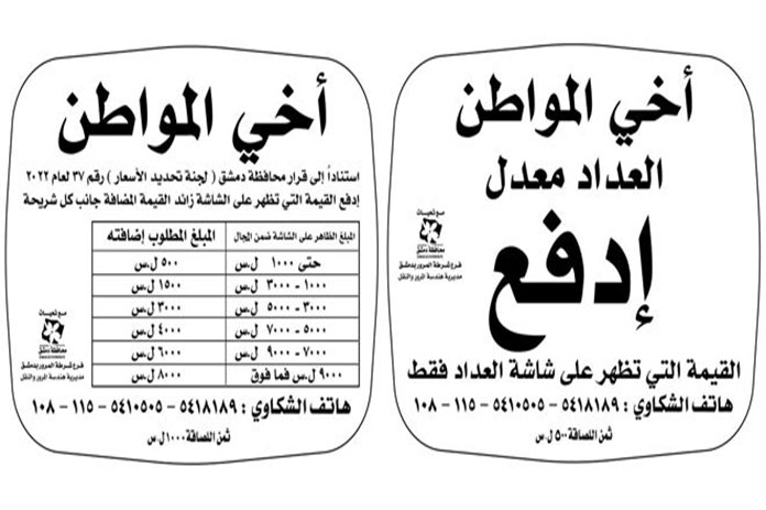 وأشار الدباس إلى أن سيارات “التكسي” التي لم تقم بتعديل العدادات سيوضع عليها لصاقات مكتوب عليها المبالغ الواجب دفعها من قبل الراكب إضافة إلى المبلغ الظاهر على شاشة العداد الحالي لافتاً إلى أنه يمكن الحصول على هذه اللصاقات من فرع مرور دمشق.