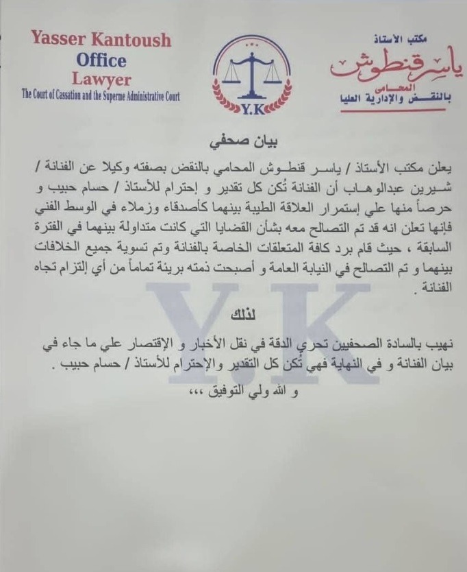 وأوضح قنطوش في بيانه، أن الفنانة شيرين عبد الوهاب تكنّ كل تقدير واحترام لـ حسام حبيب وحرصًا منها على استمرار العلاقة الطيبة بينهما كأصدقاء وزملاء في الوسط الفني فإنها تعلن أنها قد تم التصالح معه بشأن القضايا التي كانت متداولة بينهما في الفترة الأخيرة وقام برد كافة المتعلقات الخاصة بالفنانة وتسوية جميع الخلافات بينهما وتم التصالح في النيابة العامة وأصبحت ذمته بريئة تمامًا من أي التزام تجاه الفنانة.