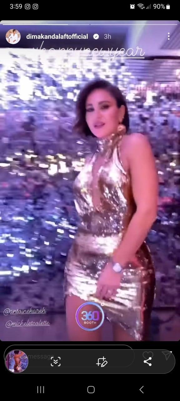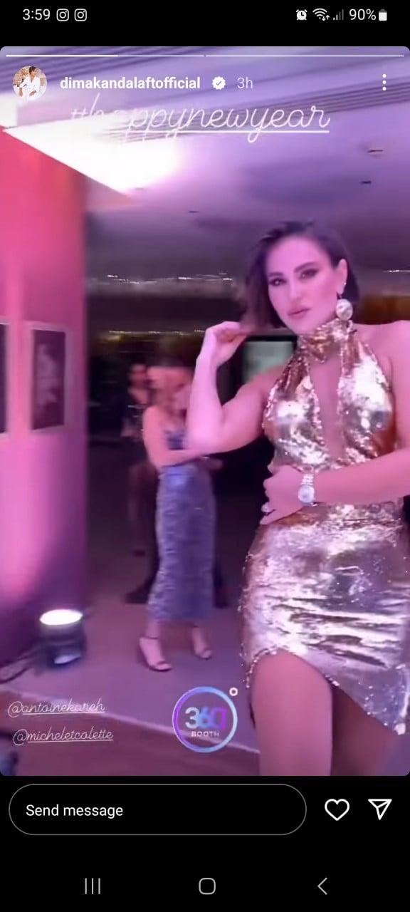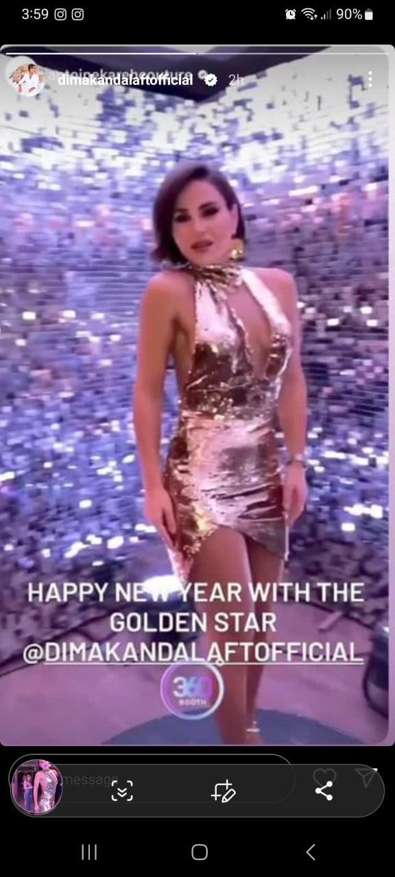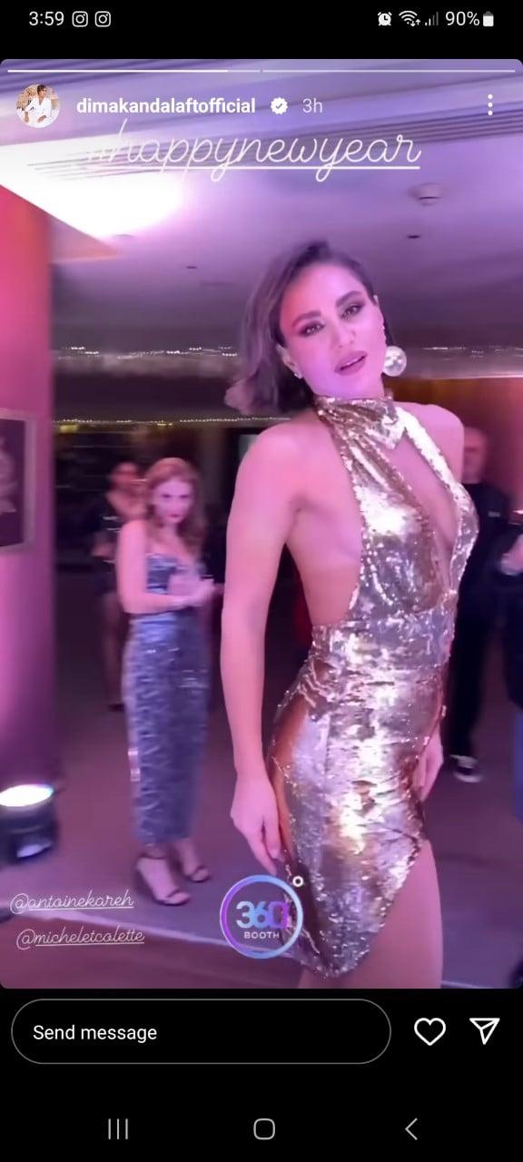وظهرت ديما التي كانت تحتفل برأس السنة الجديدة بفستان مُثير وجريء قصير باللون الذهبي ومكشوف عند منطقة الصدر والظهر.