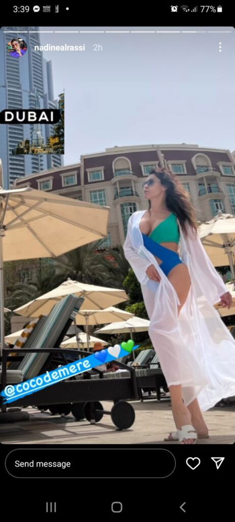 وظهرت نادين الموجودة حاليا في دبي بمايوه مُثير باللونين الأزرق والأخضر وهي تستمتع بوقتها في أحد مُنتجعات المدينة.