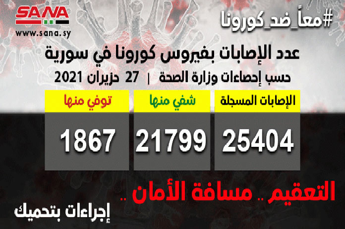 وأوضحت الوزارة في بيان تلقت سانا نسخة منه أن عدد الإصابات المسجلة في سورية بلغ حتى الآن 25404 شفيت منها 21799 وتوفيت 1867 حالة.