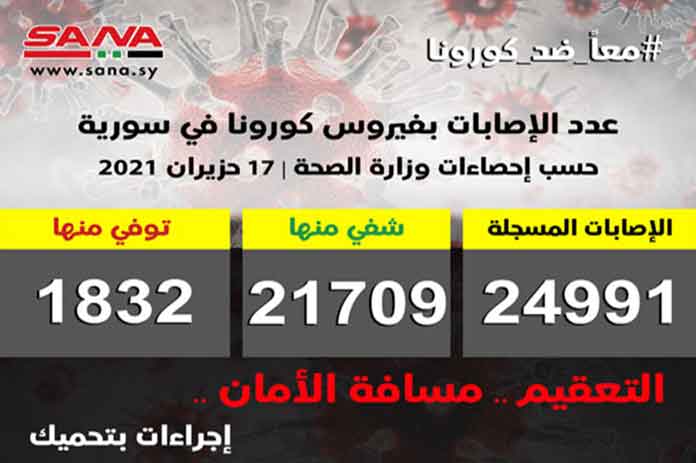 وأوضحت الوزارة في بيان تلقت سانا نسخة منه أن عدد الإصابات المسجلة في سورية بلغ حتى الآن 24991 شفيت منها 21709 وتوفيت 1832 حالة.