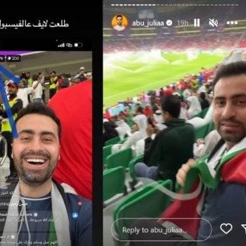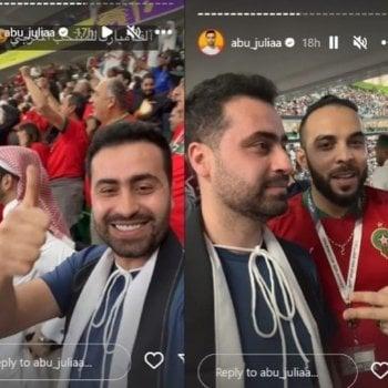 وبدا أبو جوليا سعيداً للغاية، ويشاهد مباراة المنتخبين المغربي والبرتغالي، ويشجع المنتخب المغربي، من دون أن يبدي أي إهتمام لحديث زوجته.