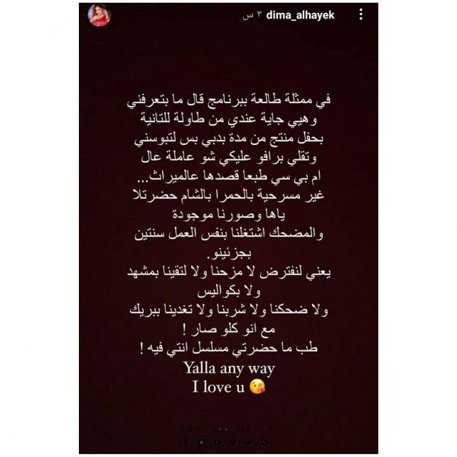 وكتبت الحايك: “في ممثلة طالعة ببرنامج قال ما بتعرفني، وهيي جاية عندي من طاولة للتانية بحفل منتج من مدة بدبي بس لتبوسني وتقلي برافو عليكي شو عاملة عال ام بي سي طبعا قصدها عالميراث”.