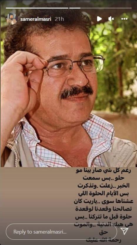وأوضح سامر من خلال صورة وتعليق نشره عبر ستوري حسابه الرسمي على موقع التواصل الاجتماعي “انستغرام” أنه مع سماعه خبر وفاة الملا نسي كل ما هو غير جميل بينهما وذكر الأيام الجميلة فقط وقال المصري: “رغم كل شي مو حلو صار بيني وبينك.. بس سمعت الخبر زعلت وتذكرت بس الأيام الحلوة اللي عشناها سوى.. ياريت كنا تصالحنا وقعدنا عالأقل قعدة حلوة قبل ما تتركنا.. بس هيي هيك الدنية.. والموت حق.. رحمة الله عليك”.