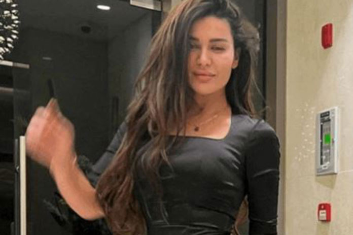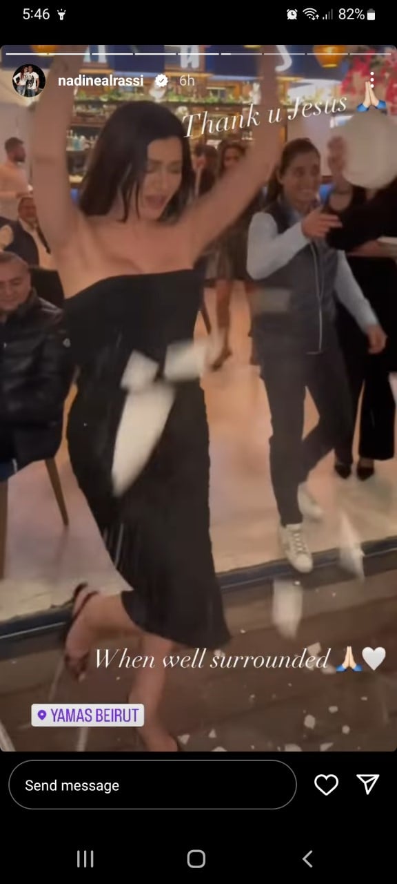 وظهرت نادين في الفيديو في إحدى السهرات مع أصدقاء لها وهي ترتدي فستاناً ضيقاً أسود اللون من دون أكمام.