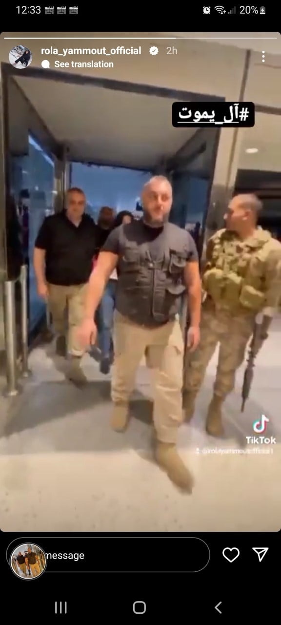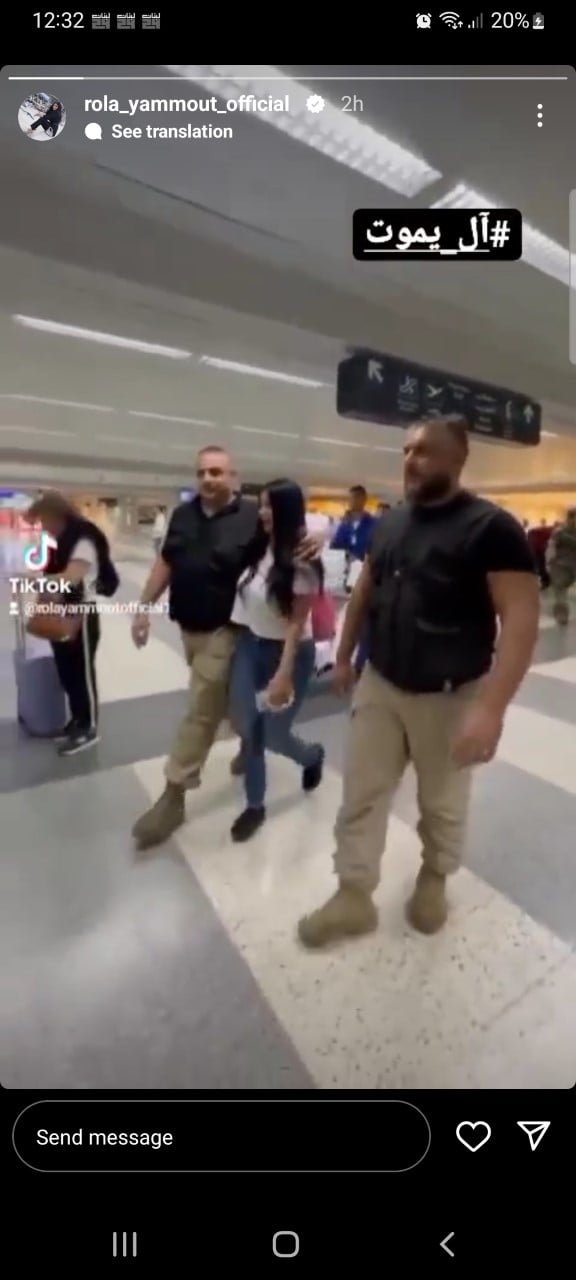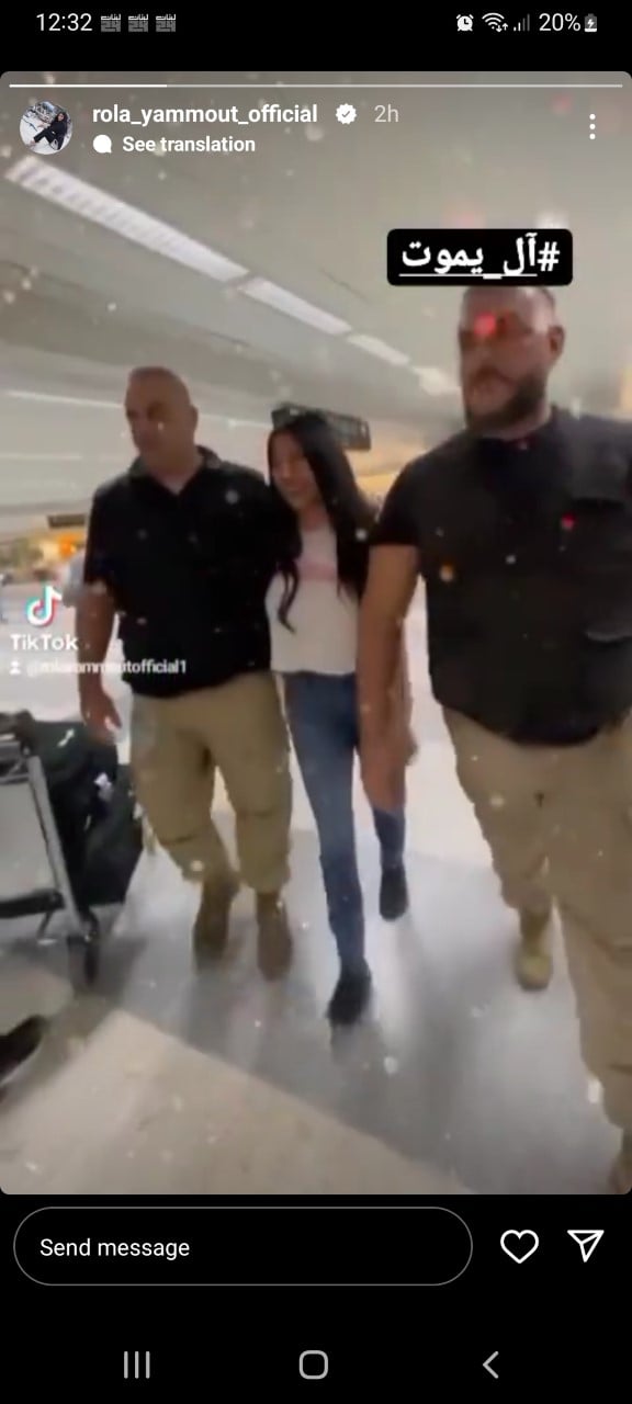 فقد ظهرت رولا بمواكبة أمنية داخل مطار رفيق الحريري الدولي، ويبدو انها كانت عائدة من تركيا حيث كانت تقيم في الفترة الأخيرة، وعلقت على الفيديو بالقول: “آل يموت”.