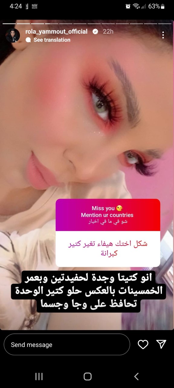 من جهة أخرى، علّقت رولا على الصور المتداولة لهيفا من حفلها بالرياض والتي ظهرت فيها بشكل مختلف ردا على إحدى المتابعات التي اعتبرت ان شكل هيفا تغير و”كتير كبرانة” بالقول: “انو كتيتا وجدة لحفيدتين وبعمر الخمسينات بالعكس حلو كتير الوحدة تحافظ على وجا وجسما “.