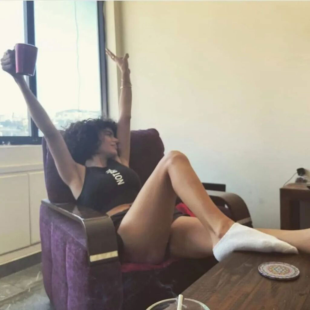 حيث ظهرت الممثلة السورية مستلقية على الكرسي، وهي مرتدية شورتاً قصيراً جداً أظهر كامل فخذيها.