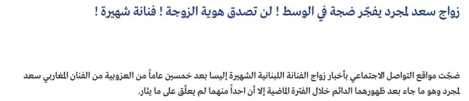 هوى الشام| أفادت بعض المواقع الالكترونية الى ان الفنانة اللبنانية إليسا قد تزوجت من الفنان المغربي سعد لمجرد وان الديو الغنائي الذي جمعهما هو تجسيد لقصة حبهما.
