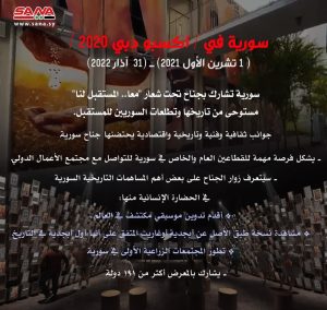 هوى الشام| تشارك سورية في معرض “اكسبو دبي 2020” الدولي الذي ينطلق الجمعة بجناح حيث يقدم رؤية شاملة عن التاريخ والثقافة والفنون والاقتصاد السوري.