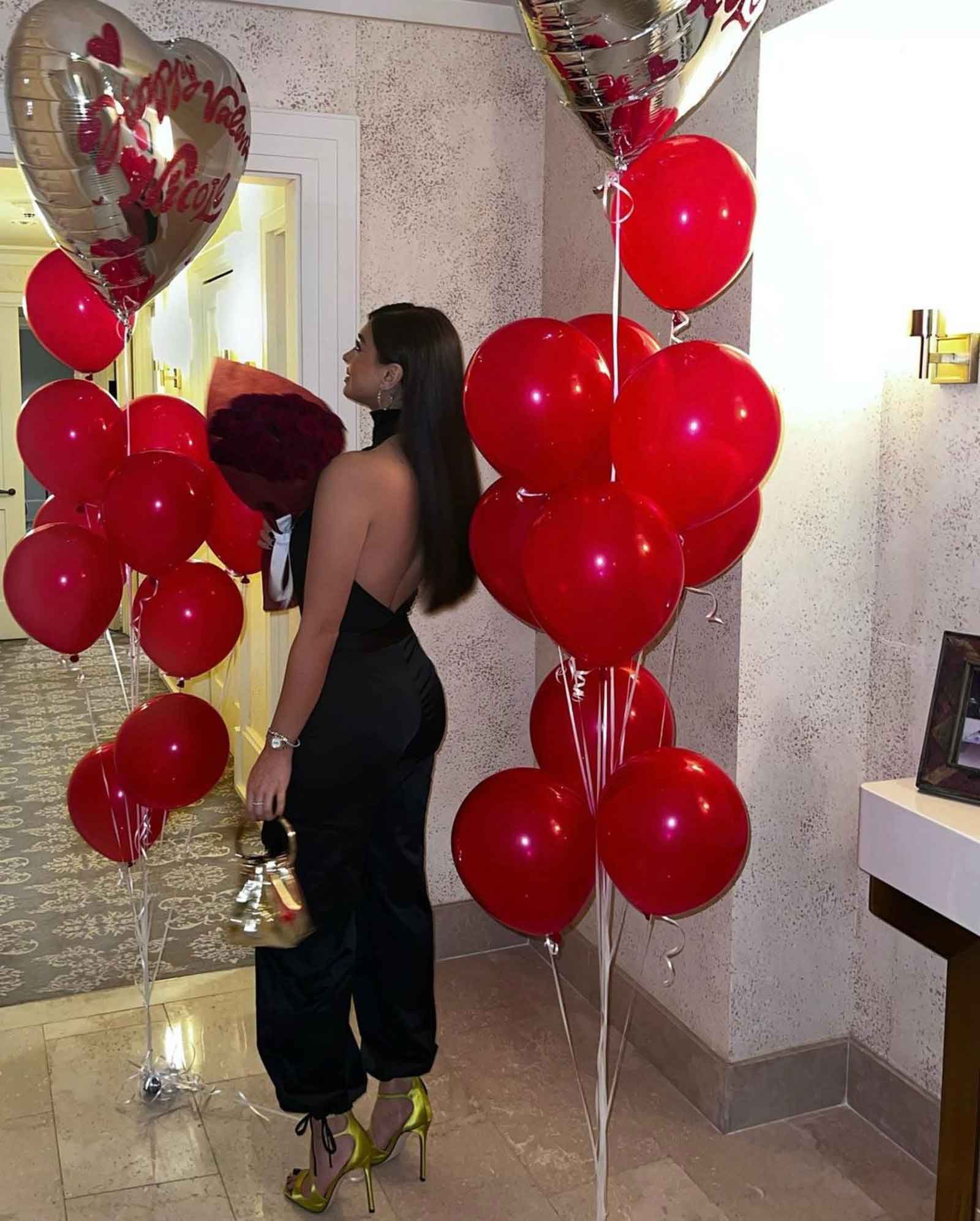حيث نشرت صورا لها وهي تستعرض مفاجأة مميزة في بيتها من حبيبها المخرج المصري طارق العريان وزينها بالبالونات الحمراء مع اسمها الى جانب باقة ورد حمراء،