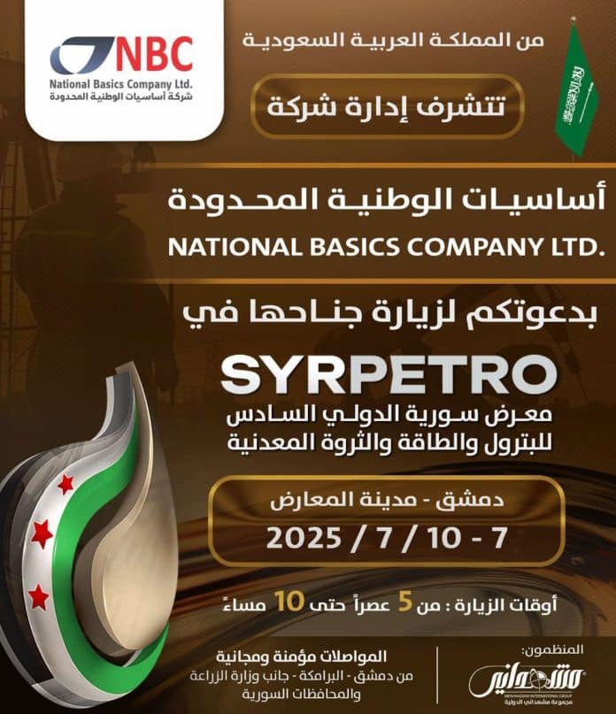 هوى الشام| تتشرف شركة أساسيات الوطنية المحدودة (NBC) من المملكة العربية السعودية بدعوتكم لزيارة جناحها F1 في القاعة 1 في معرض سوريا الدولي للبترول والطاقة والثروة المعدنية “سيربترو 2025″، الذي يقام برعاية وزارة الطاقة السورية وتنظمه مجموعة المشهداني الدولية على أرض مدينة المعارض في دمشق.