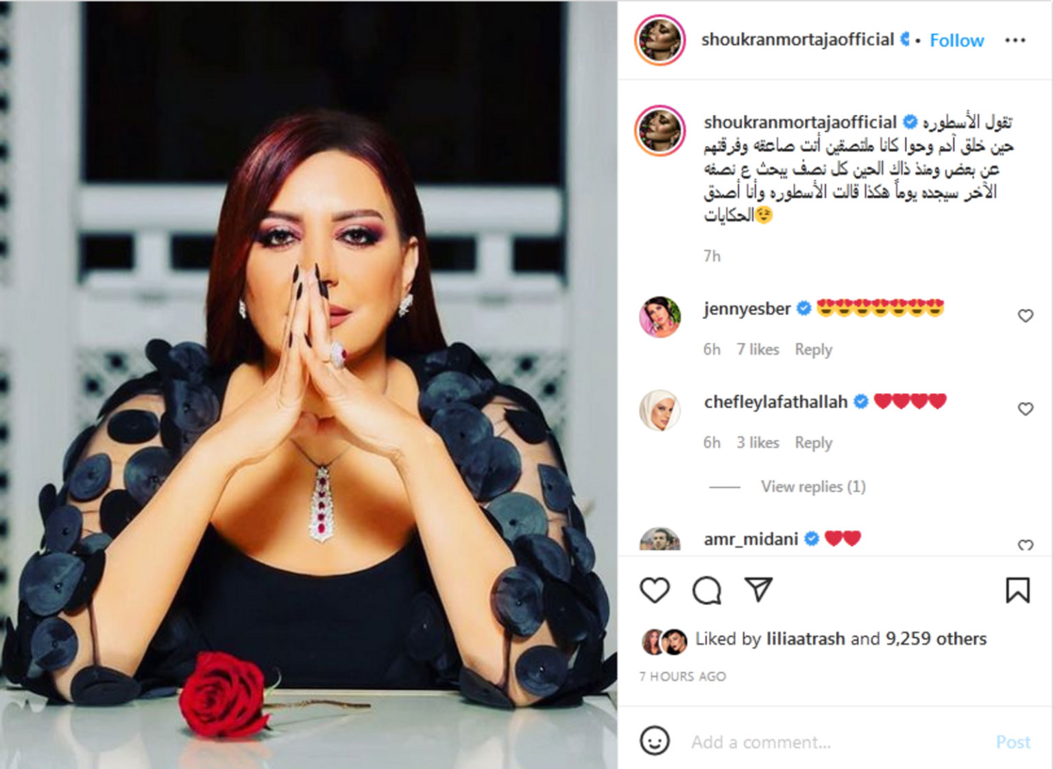 وأرفقت شكران مرتجى الصورة التي نشرتها بتعليق :”تقول الأسطورة حين خلق آدم وحوا كانا ملتصقين أتت صاعقه وفرقتهم عن بعض ومنذ ذاك الحين كل نصف يبحث ع نصفه الآخر سيجده يوماً هكذا قالت الأسطورة وأنا أحب أن أصدق الحكايات”.