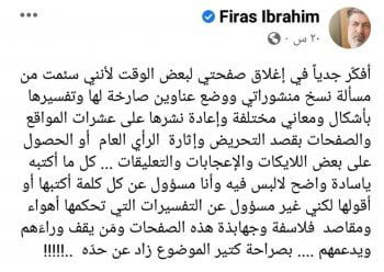 وكتب فراس إبراهيم عبر صفحته الخاصة على موقع التواصل الإجتماعي: “أفكّر جدياً في إغلاق صفحتي لبعض الوقت لأنني سئمت من مسألة نسخ منشوراتي ووضع عناوين صارخة لها وتفسيرها بأشكال ومعاني مختلفة وإعادة نشرها على عشرات المواقع والصفحات بقصد التحريض وإثارة الرأي العام أو الحصول على بعض اللايكات والإعجابات والتعليقات”.