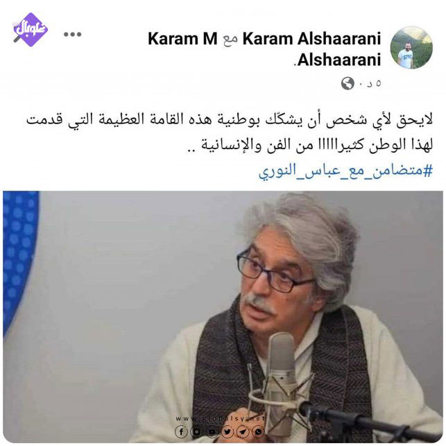 فنانو سورية يعلنون دعمهم له عبر هاشتاغ “متضامن_مع_عباس_النوري ” الذي أطلقته زوجته الكاتبة عنود الخالد لدعم النوري.