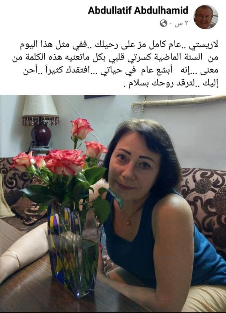 هوى الشام| استعاد المخرج السوري عبد اللطيف عبد الحميد ذكرى وفاة زوجته الراحلة مصممة الأزياء لاريسيا عبد الحميد التي توفيت العام الفائت.