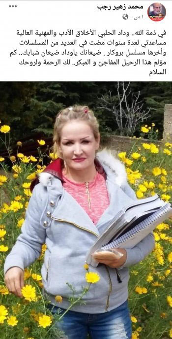 أما الممثلة علا بدر فوصفتها بالخلوقة والمجتهدة معبرة عن ذلك بقولها: “السكريبت وداد الحلبي يعني الاجتهاد يعني الاخلاص يعني الأكابرية والاخلاق والله مو عرفانة شو قول رحتي لعند الاحن الله يرحمك ويصبر اهلك ومحبينك خبر اكتر من مؤلم وصادم لاحول ولا قوة الا بالله العلي العظيم”.