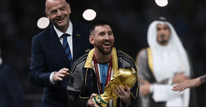 هوى الشام| احتفل نجم الكرة الأرجنتيني، ليونيل ميسي، بنيل الكأس في مونديال قطر، بحلة “استثنائية”، بعدما ارتدى عباءة “البشت”، في حلة تعكس ثقافة البلد الخليجي المضيف، ثم راح يرفع الكأس مع زملائه، وسط حالة انتشاء بالإنجاز الكبير.