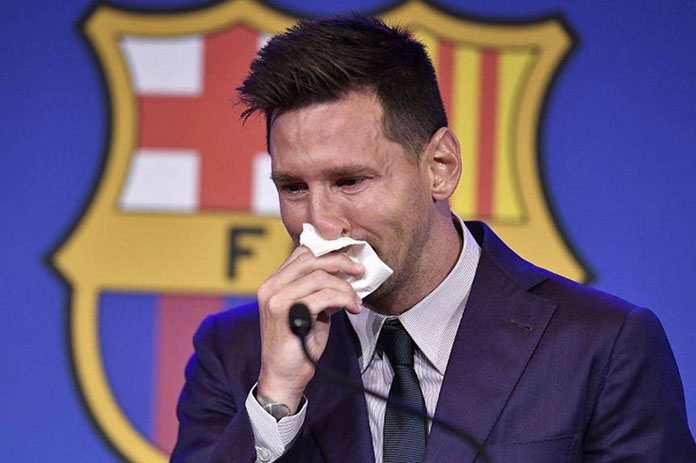 ودخل ميسي منهارا والدموع تنهمر من عينيه، في المؤتمر الصحفي الوداعي، أمام حضور مكون من زملائه اللاعبين وعائلته.